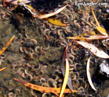 As detritus feeders, scuds enjoy being in moist leaf litter which typically builds up in the slack water along the East Walker River. Scuds provide a rich source of protein to trout once they enter the drift (i.e., elevated flows or releases from the reservior). Although the bigger browns focus their energy on minnows and tui chubs, scuds are taken by hungry, smaller browns in the drift.