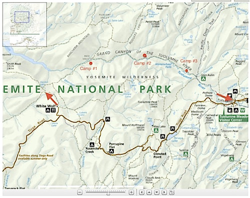 If you choose to start the trip into the Grand Canyon of the Tuolumne River leaving from White Wolf Campground, Yosemite National Park and you are not planning to park a shuttle car at the take-out of this trip, then a “Hikers’ Bus” is available from Tuolumne Meadows and back to White Wolf. Visit Yosemite's Travel Service Site for details. Otherwise you'll need to have a shuttle car parked in the Tuolumne Meadows area.